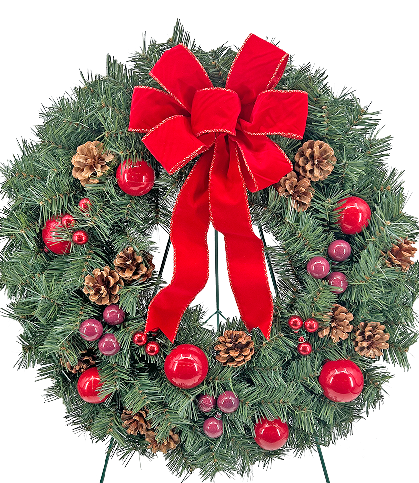 Pine wreath decorated with pine cones, holly and a full-length bow.